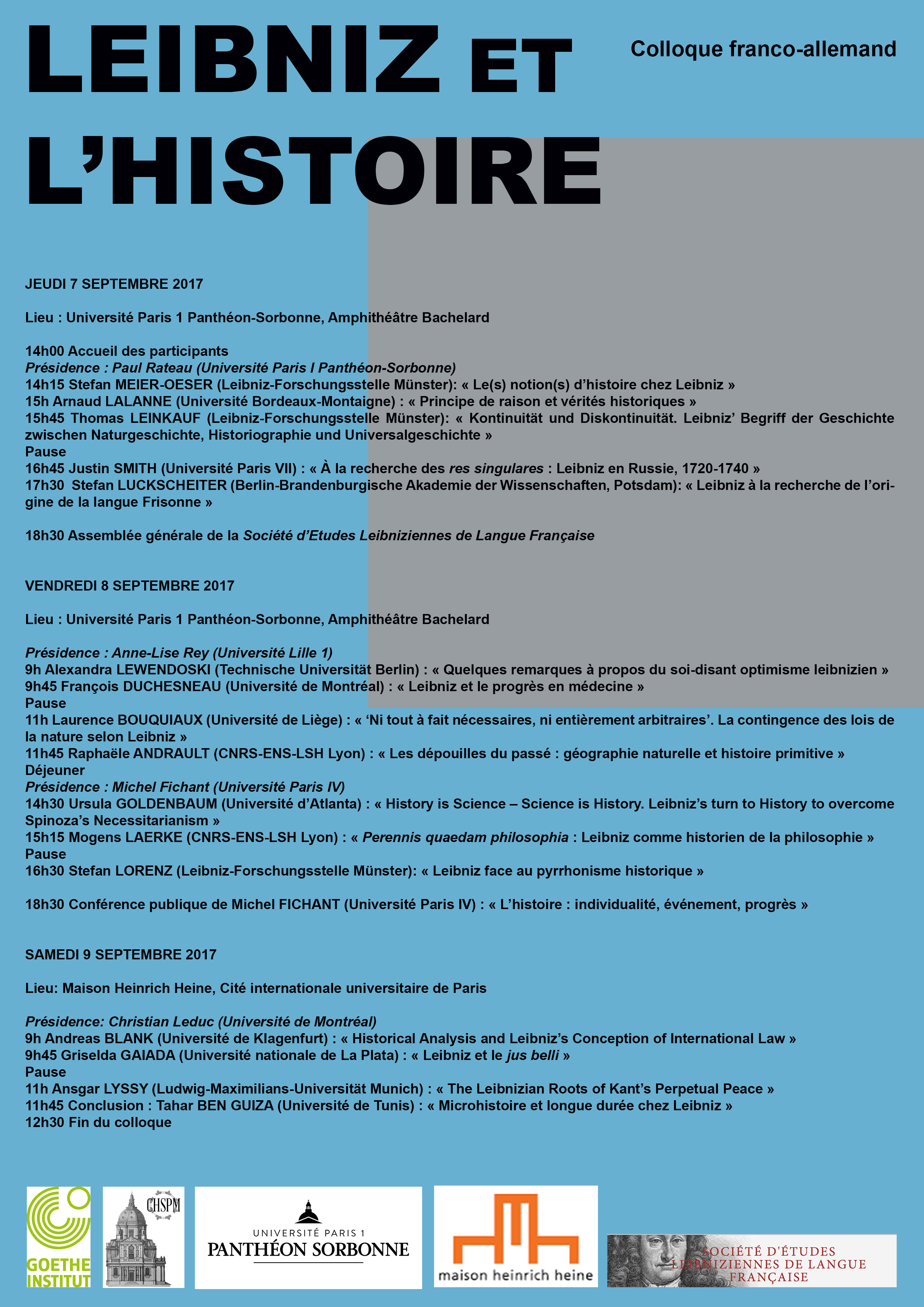 _ Du 7 au 9 septembre 2017 aura lieu à Paris le colloque franco-allemand « Leibniz et l’histoire » à l’Université Panthéon-Sorbonne et à la Maison Heinrich Heine.